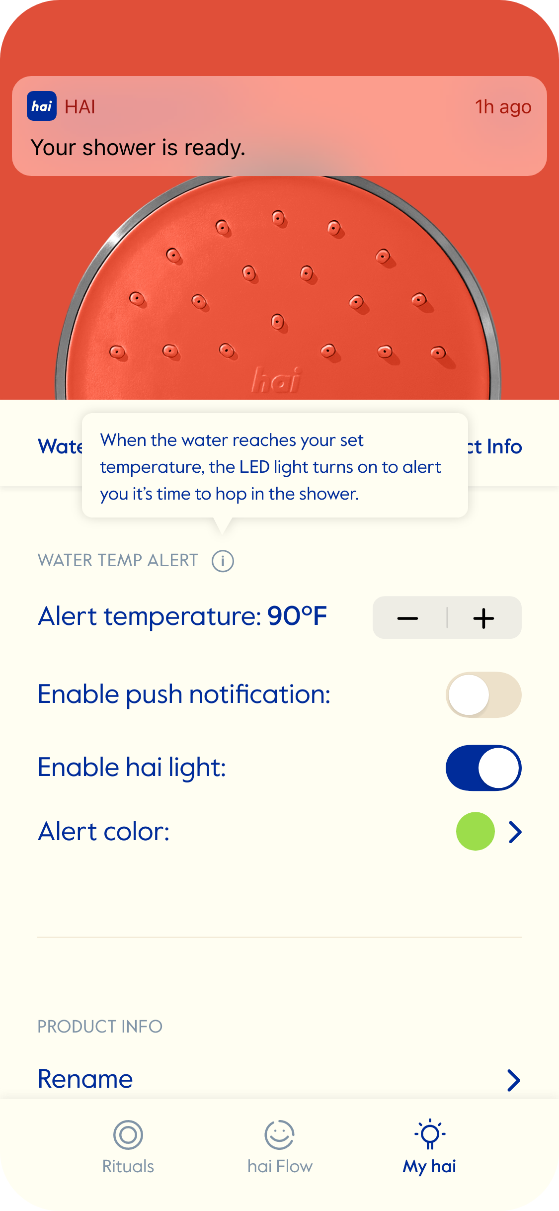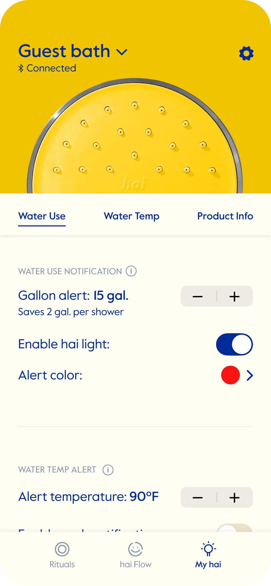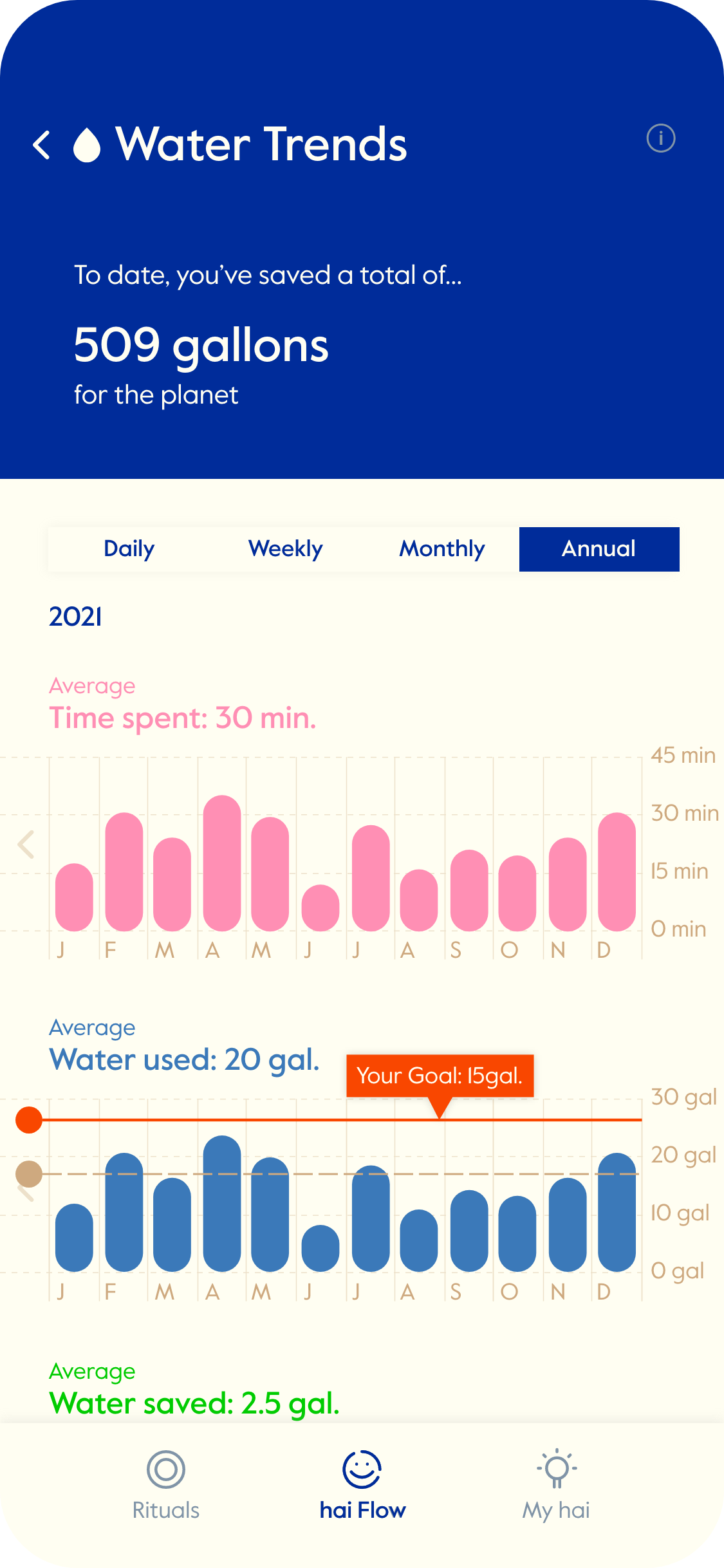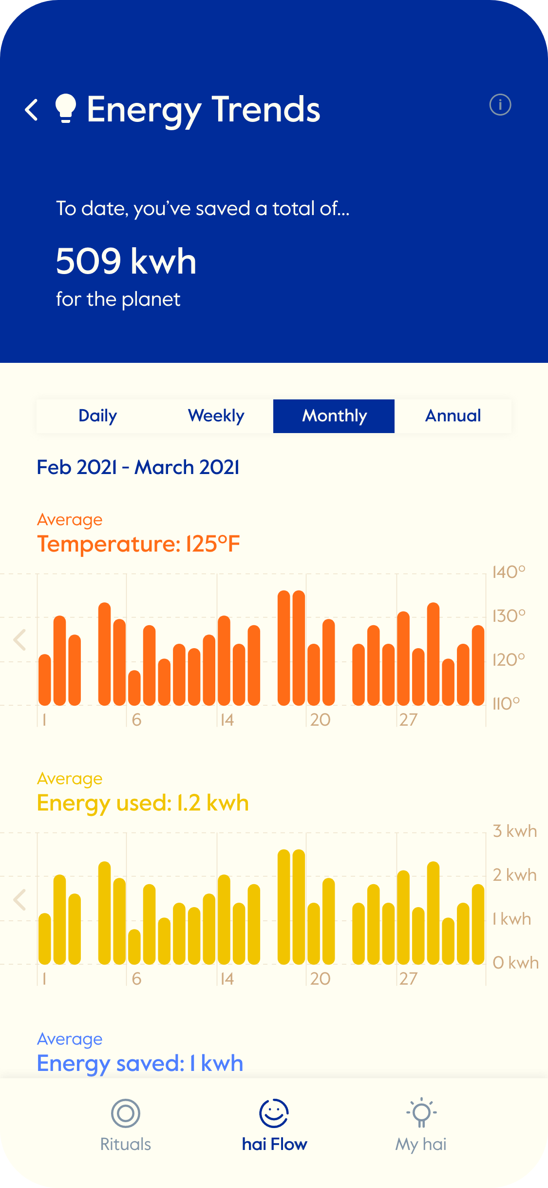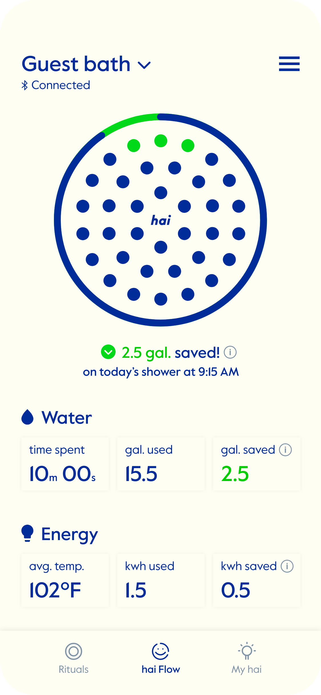 A shower that carbon offsets its own footprint overtime. With the right tools to reduce water and energy waste, hai users save on average 30% more water.